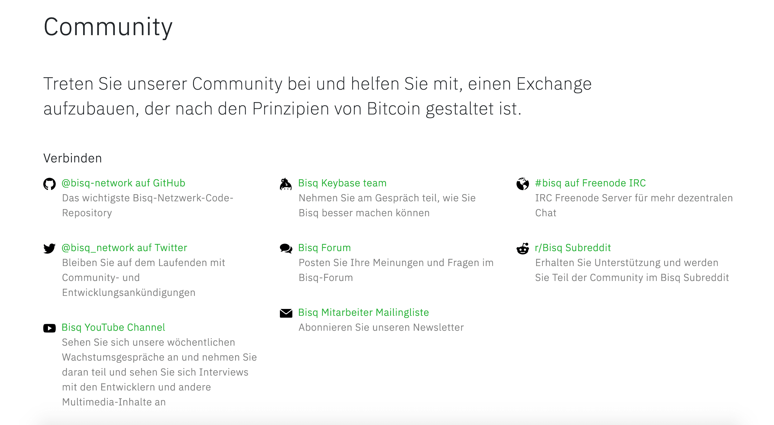 Bei den Kernfunktionen werden Informationen rund um die Plattform und App an sich aufgegriffen. Hier erfahren Interessierte, wo die Vorteile liegen und welche Eigenschaften Bitsquare mitbringt. In Bezug auf die Handelsdetails werden vor allem Fragen zu möglichen Kosten und Abläufen aufgegriffen. Auch der Prozess der Streitbeilegung wird sehr detailliert beschrieben.
