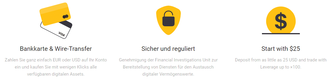 Die Einzahlung beispielsweise in Euro muss über einen Mindestbetrag von 25 Euro erfolgen. Dabei fallen prozentuale Gebühren an, die davon abhängen, ob man per Kreditkarte oder Banküberweisung einzahlt. Kunden, die digitale Assets deponieren, zahlen dafür hingegen keinerlei Bearbeitungsgebühr.