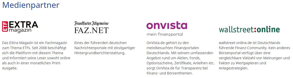 Im Test haben wir auch gesehen, dass zu den Medienpartnern auch wallstreet-online.de und OnVista.de zählen. wallstreet-online.de ist vielen Anlegern vielleicht als führende Finanz-Community ein Begriff. Zu den meistbesuchten Finanzportalen gehört OnVista.de, in dem die Kunden sämtliche Informationen rund um Zertifikate, Aktien, Fonds und andere Finanzprodukte finden. Auch hier wurden die Leistungen von easyfolio bereits thematisiert.