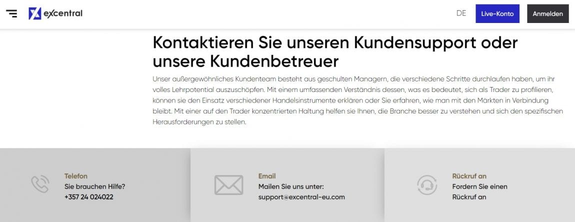 Die Qualität des Kundensupports sagt viel über dem Broker selbst aus, das konnten die unzähligen Tests bei vielen Anbietern bereits mehrfach feststellen. Grund genug, um genauer hinzuschauen, wie es mit den eXcentral CFD Erfahrungen bzw. den Erfahrungen mit dem Kundensupport bestellt ist. Die Händler haben Zugriff auf verschiedene Kommunikationswege:
