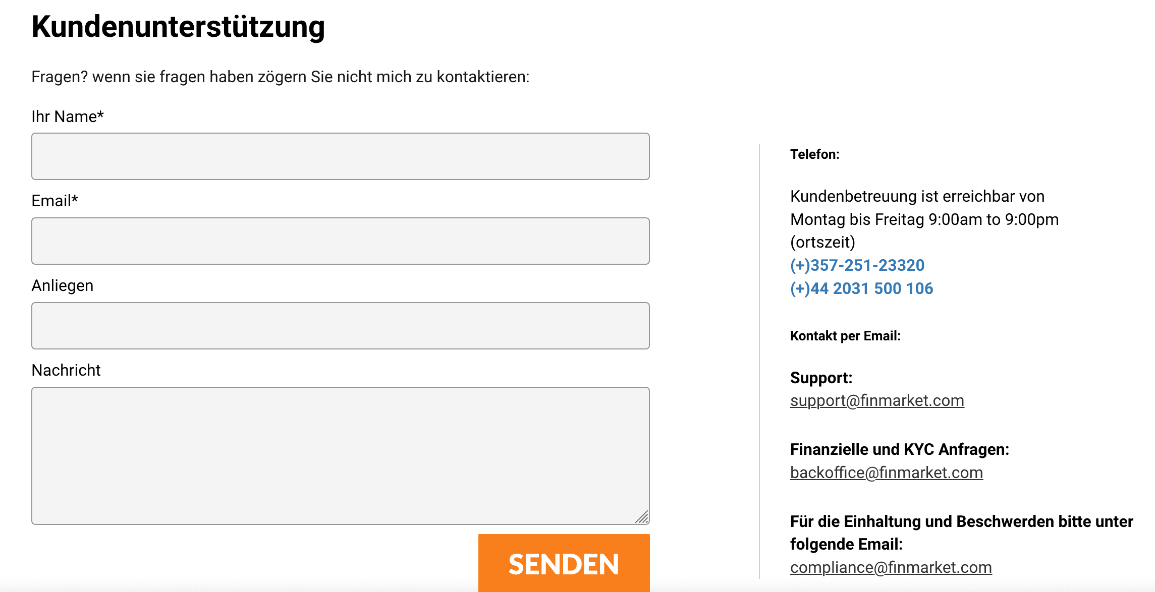 Kunden und Interessenten können den Support zudem entweder telefonisch oder per Mail kontaktieren auch ein Kontaktformular steht auf der Webseite bereit. Bei den Kontaktmöglichkeiten gibt es allerdings ein großes Manko: Trader können keine Hotline in Deutschland nutzen. Stattdessen stehen nur Telefonnummern mit britischer oder zypriotischer Vorwahl zur Verfügung. Da die wenigsten dorthin kostenfrei telefonieren können, verursacht die Hotline natürlich Folgekosten, die Kunden bei ihrem Netzanbieter erfragen sollten. FinMarket selbst erhebt allerdings keine Gebühren.