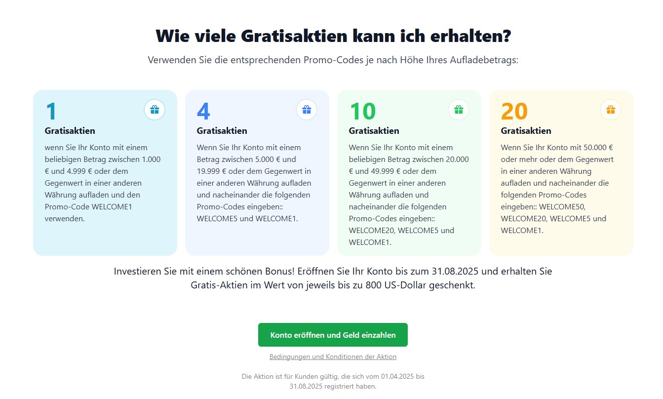 Im Zeitraum vom 1. April bis einschließlich 31. Oktober 2025 haben Sie als neuer Kunde bei Freedom24 die Möglichkeit, im Rahmen einer attraktiven Willkommensaktion von GratisAktien zu profitieren. Wenn Sie mindestens 1.000 Euro auf Ihr neu eröffnetes Depot einzahlen, können Sie durch die Eingabe bestimmter Promo-Codes sogenannte Coupons aktivieren, die jeweils in eine GratisAktie umgewandelt werden