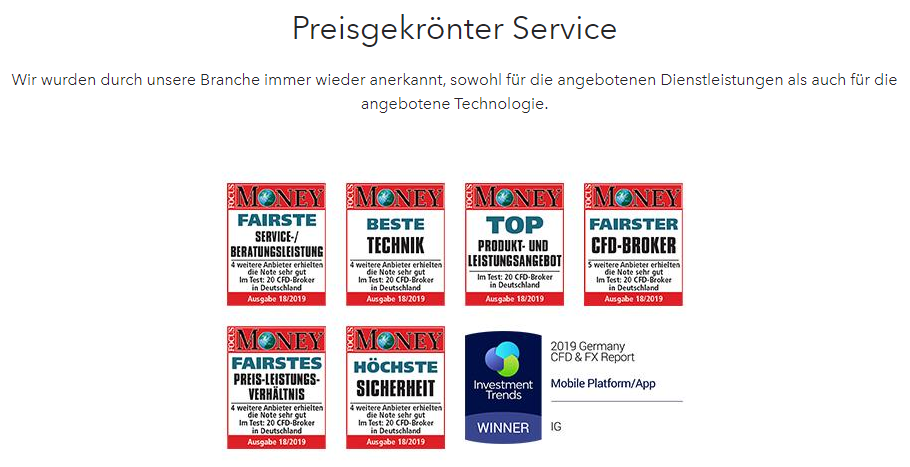 Im Verlauf der langjährigen Tätigkeit als Broker konnte sich IG eine Reihe von Auszeichnungen sichern. Diese wurden sowohl von zufriedenen Kunden als auch von Experten verliehen.
