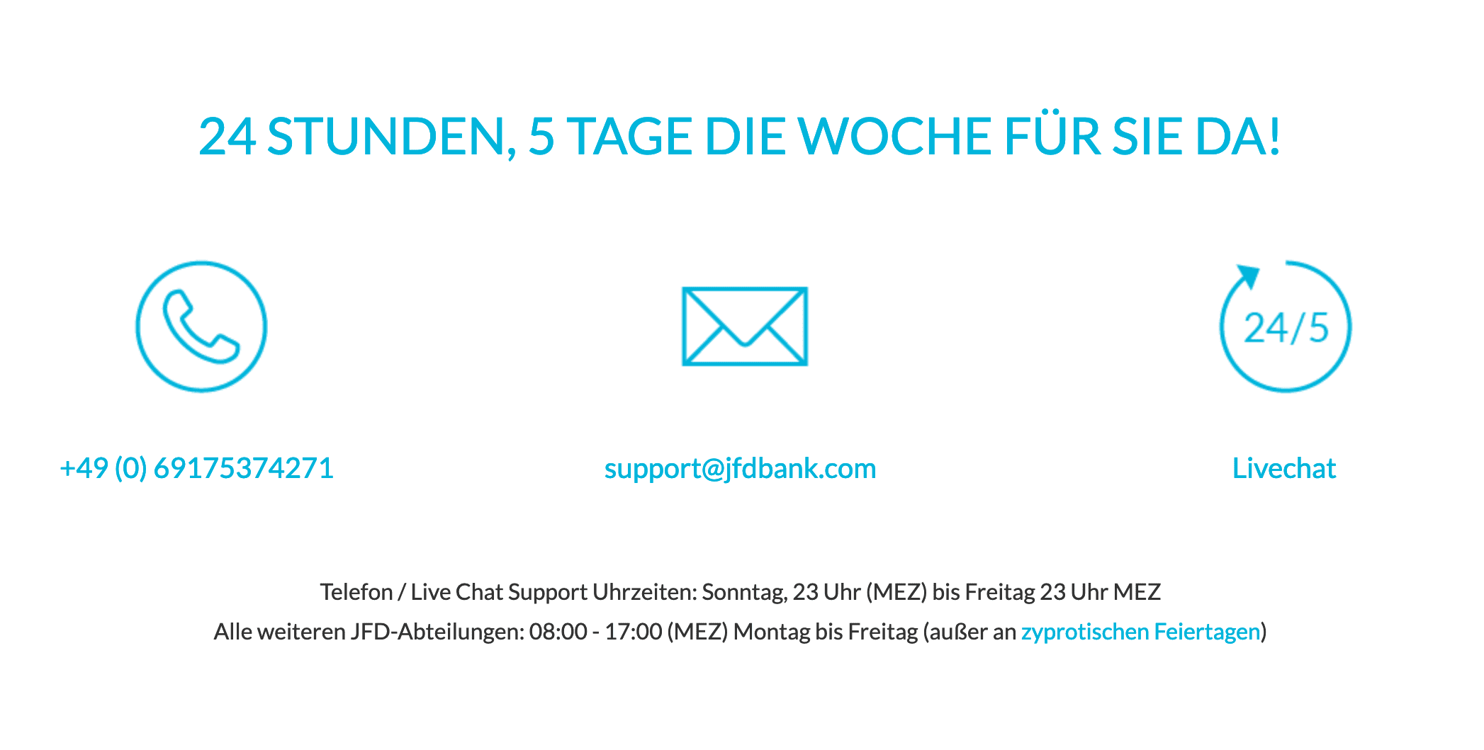 JFD Brokers legt schon einmal beste Grundlagen, um einen guten Kundenservice zustellen. Das Unternehmen ist an Börsentagen rund um die Uhr erreichbar. Dies gilt sowohl für das Telefon als auch für den LiveChat. Alle anderen Abteilungen stehen immerhin von 08:00 bis 17:00 Uhr zur Verfügung.