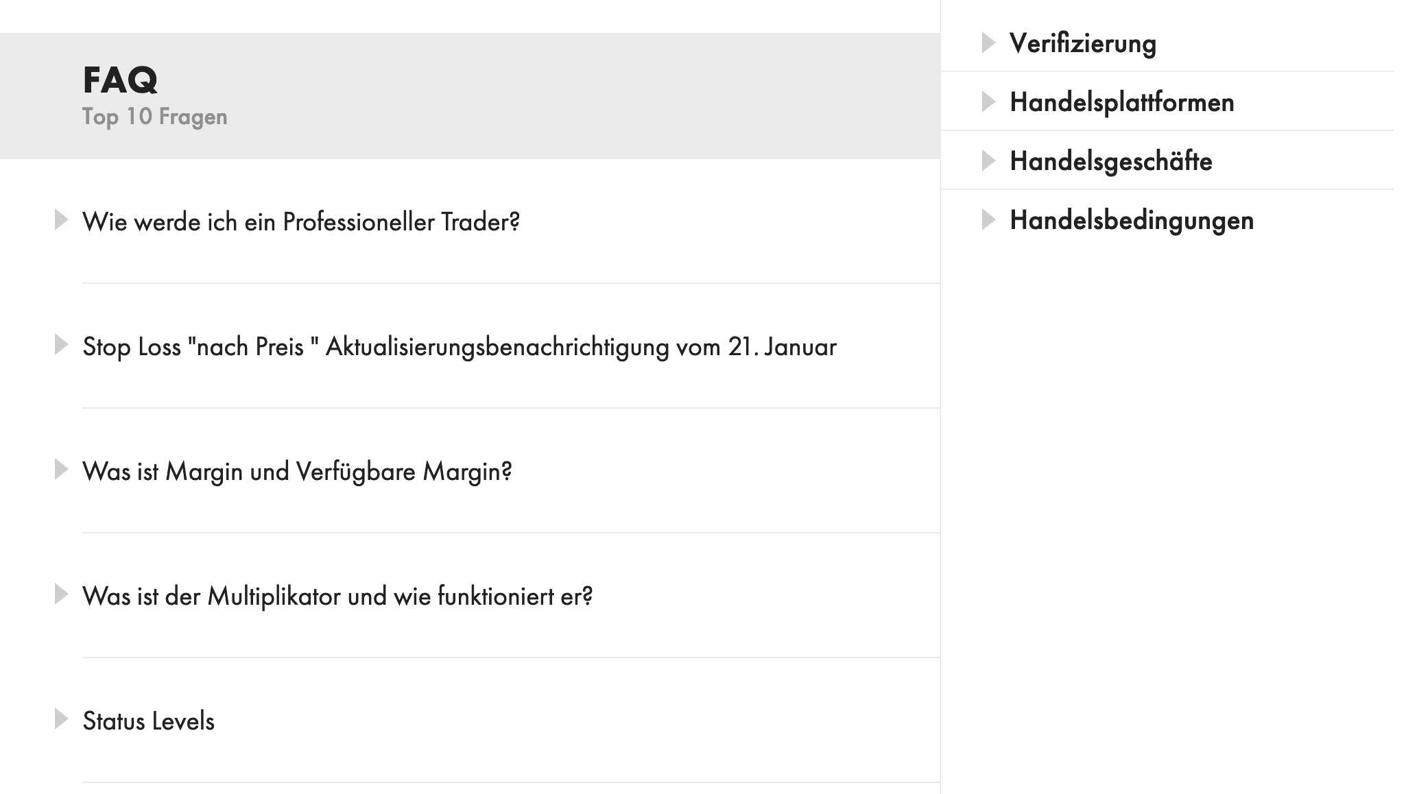 Wer sich auf der Website des Brokers informieren will, erlebt eine Irrfahrt durch verschiedene Internetauftritte. Die zunächst auf Deutsch abrufbare Seite ist lediglich eine Landingpage, die werbenden Charakter hat. Eine weitere Suche führt zum Webauftritt Libertex.org, der sich an internationale Klienten wendet. Daher sind die Informationen etwa zu den Hebeln für deutsche Trader nicht relevant. Erst wenn man ein Demo- oder Handelskonto anmeldet, reagiert das System und leitet zu einer deutschen Website um. Diese besteht zum Teil aus der Libertex-Trading App, die browserbasiert ist, und einer Service-Komponente. Letztere glänzt nicht durch logische Menüführung. Die FAQ entpuppt sich als Liste von Tutorials – eine FAQ gibt es aber doch, nur versteckt sie sich unter den Kontaktinformationen.