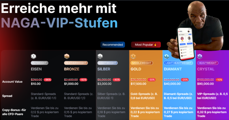 Die höheren Kontostufen bei NAGA bieten Anlegern vorwiegend reduzierte Handelskosten und erweiterten Service.