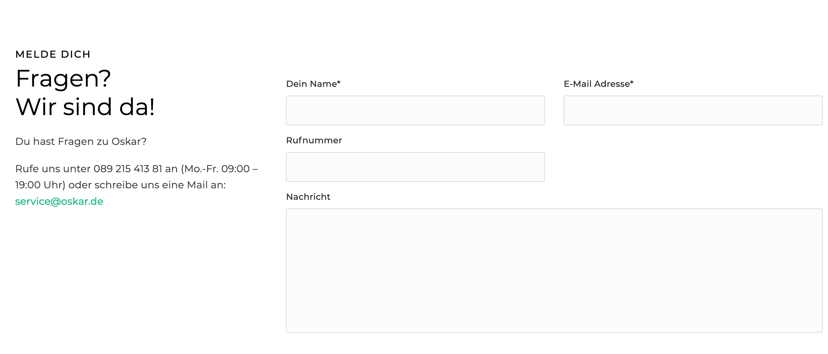 Wer mehr über das Angebot von OSKAR erfahren möchte, kann sich auch an den Kundensupport des Unternehmens wenden. Erreichbar ist der Kundensupport von montags bis freitags zwischen 09:00 bis 19:00 Uhr. Servicezeiten für das Wochenende sind nicht aufgeführt. Zu den Kontaktwegen gehören die gängigen Kanäle. Neben dem telefonischen Kontakt können Kunden oder interessierte Anleger ihre Fragen auch per E-Mail oder über das bereitgestellte Kontaktformular anbringen. Ein Live-Chat findet sich nicht unter den Kontaktwegen. Das Serviceangebot präsentiert sich bei unseren OSKAR Erfahrungen insgesamt gut.