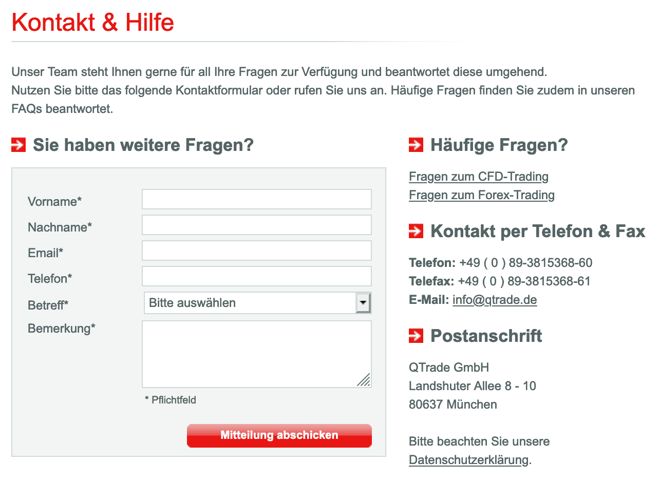 Unsere Erfahrungen mit QTrade haben gezeigt, dass der Kundensupport des Unternehmens eindeutig auf die Ansprüche von deutschen Kunden zugeschnitten ist. Aber auch ein Support in englischer Sprache ist verfügbar. Bei dem Broker ist es möglich, allgemeine Fragen zum Thema Trading, zu dem Handelsangebot oder zum Broker selbst über eine Hotline oder das Kontaktformular auf der Webseite zu stellen. Auf einen Live Chat müssen die Trader bei QTrade verzichten, dieser steht nicht zur Verfügung.