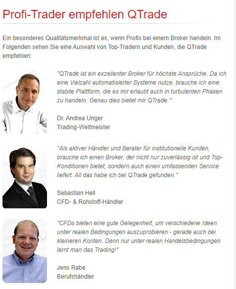 Der Online-Broker QTrade ist aufgrund seiner langjährigen Tätigkeit am Finanzmarkt durchaus bekannt und findet aus diesem Grund auch in der Fachpresse oft Erwähnung. Dazu zählen unter anderem Magazine wie Derivate Magazin, RuMaS, Traders‘ und Finanzen.net. Auch zahlreiche Profi-Trader haben mit QTrade Erfahrungen gemacht. In Interviews, die der Broker regelmäßig mit erfolgreichen Tradern durchführt, stellen diese ihre eigenen Handelsstrategien vor und helfen somit auch Branchen-Neulingen dabei, einen guten Einstieg in die Welt des Tradings zu finden. Weiterhin können die Kunden des Brokers über den News-Kanal sämtliche Informationen zum Unternehmen, News und Pressemitteilungen einsehen.