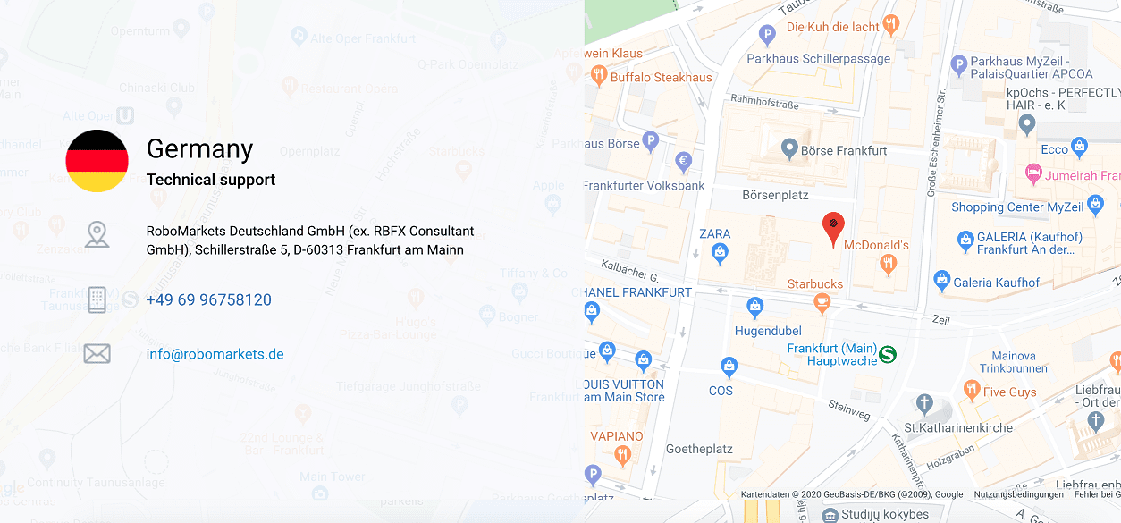 Wer die gesuchten Informationen nicht über die Website findet, kann sich mit offenen Fragen an den Kundenservice wenden. Der Kundenservice kann über verschiedene Kanäle erreicht werden. Unter den Kontaktmöglichkeiten findet sich ein Live-Support, der rund um die Uhr kontaktiert werden kann. Der Kundensupport ist insgesamt überzeugend aufgestellt. Für den deutschen Kundenservice ist die RoboMarkets Deutschland GmbH zuständig. Wer das Gespräch mit einem Mitarbeiter sucht, kann den Kontakt telefonisch herstellen. Darüber hinaus besteht die Möglichkeit den Rückruf-Service zu nutzen.