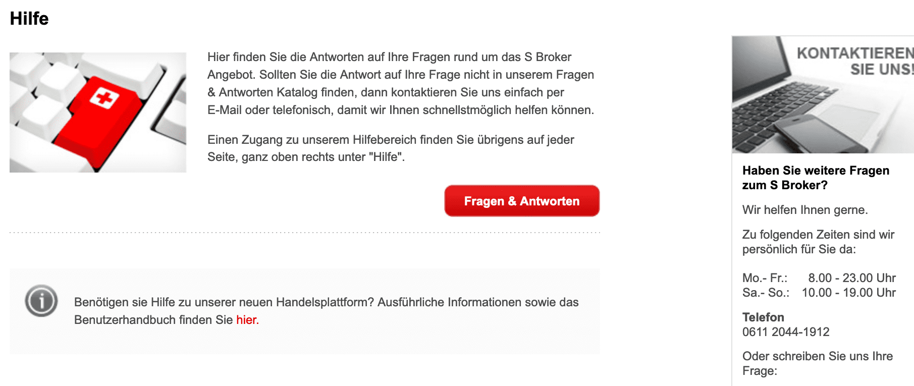 Der S Broker gilt unter Branchenkennern als einer der kundenfreundlichsten Broker, denn das an die Sparkassen-Finanzgruppe angeschlossene Unternehmen bietet einen umfassenden Kundenservice und zahlreiche Zusatzleistungen an. Dadurch wird das Trading bei diesem Anbieter regelmäßig in Finanzmagazinen auch für Einsteiger empfohlen, welche sich bei Fragen oder Problemen auf den kundenorientierten Service verlassen können, welcher auch am Wochenende erreichbar ist.