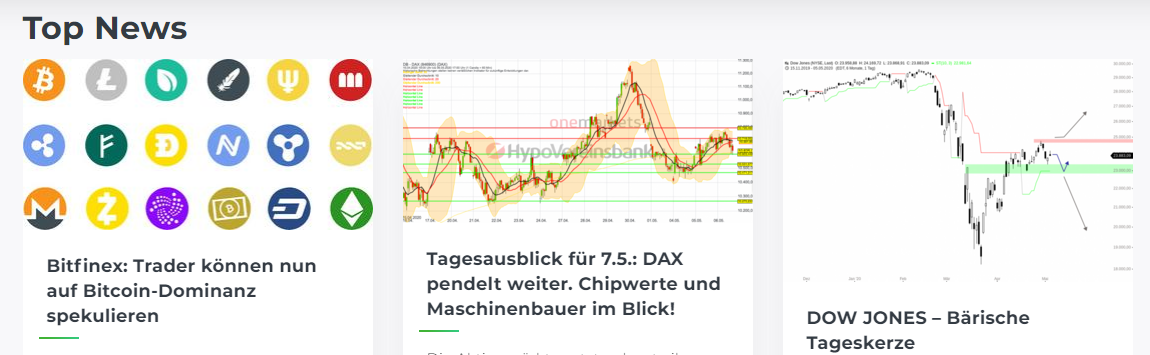 So werden beispielsweise aktuelle Aktienkurse der wichtigsten Papiere direkt im oberen Bereich der Website zur Verfügung gestellt. Auch der DAX sowie zahlreiche andere Marktdaten haben einen Anzeigenplatz im rechten Bereich der Homepage. Hinzu kommen alle aktuellen Währungskurse der wichtigsten Paarungen (Anzeige ebenfalls rechts auf der Website). Solch einen Informationsgehalt bieten laut unseren Erfahrungen nicht einmal viele Broker – hier ist er sogar kostenlos.