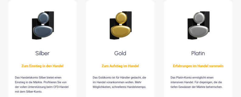 - Silber-Konto: Standardkonto mit Zugang zu allen handelbaren Märkten.