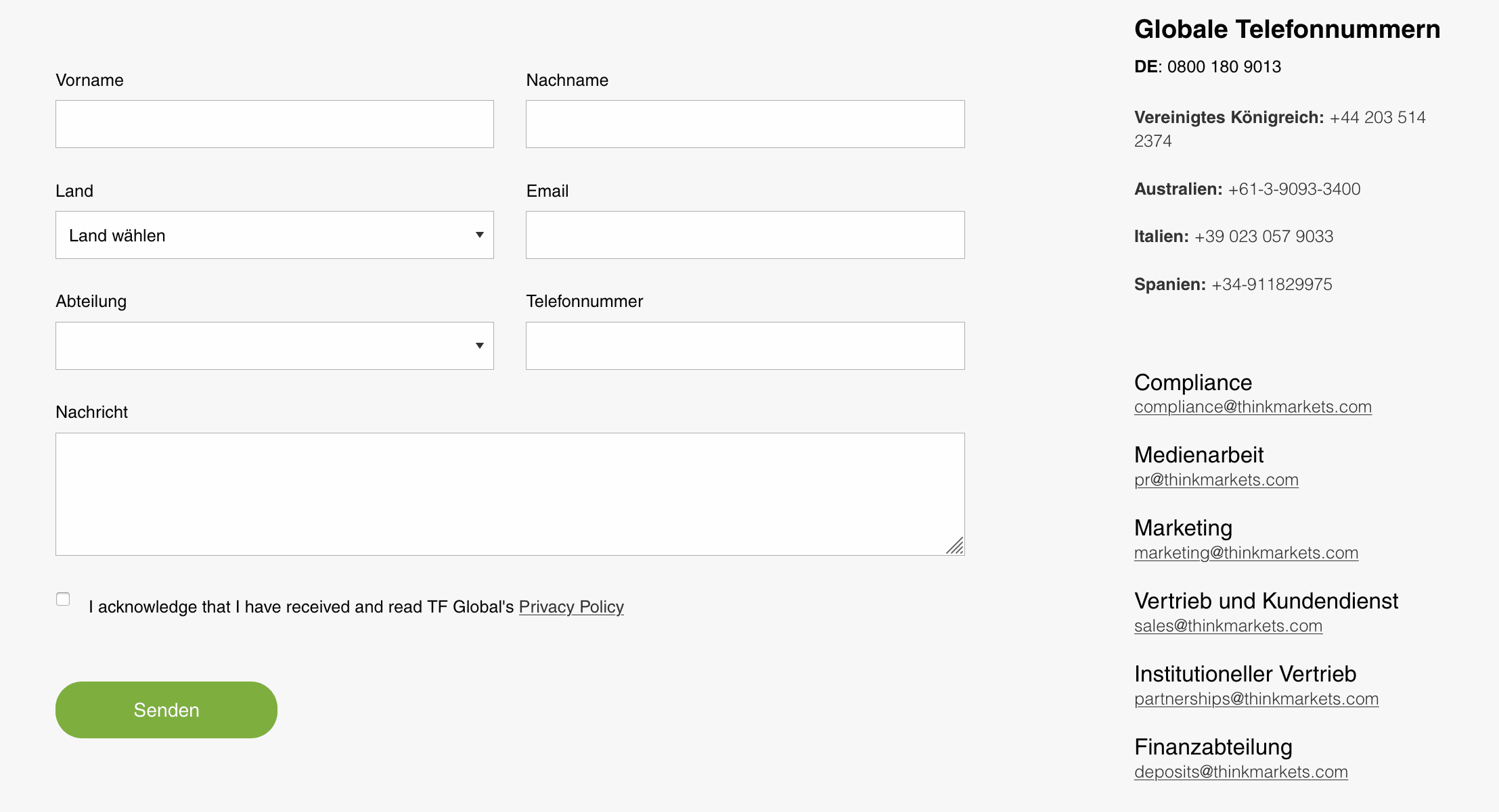 Anleger, die Fragen rund um den ThinkMarkets Handel oder ihr Konto haben, können sich an den Support wenden. Allerdings sind die Geschäftszeiten hier eingeschränkt. Der Broker orientiert sich dabei an den australischen Zeiten, genauer gesagt in Geschäftszeiten in Melbourne. Deshalb steht der Kundensupport nur eingeschränkt zur Verfügung: