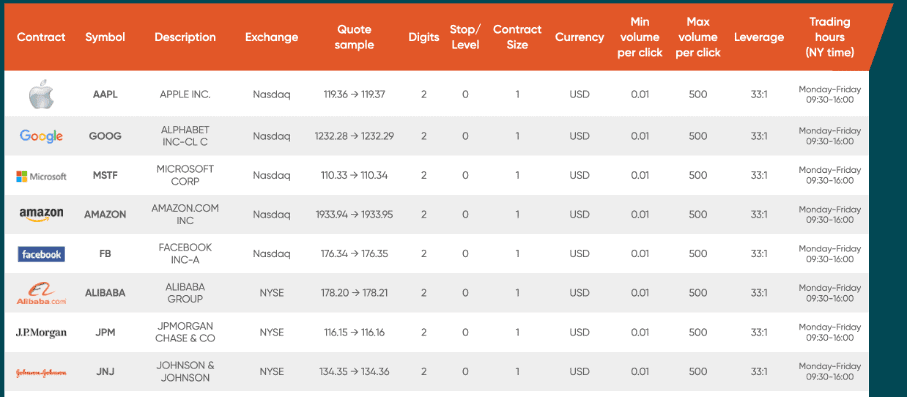 Bei Vantage Markets können Kunden mit CFD-Hebel die Aktien der 50 größten börsennotierten Unternehmen in den Vereinigten Staaten handeln. Diese sind sowohl mit kurzen als auch mit langen Laufzeiten erhältlich, und die Gebühr pro Transaktion beträgt pauschal 6 $. Damit hat der Broker deutlich weniger Auswahl an Titel als viele andere CFD-Broker, die weitaus mehr Werte im Angebot haben.