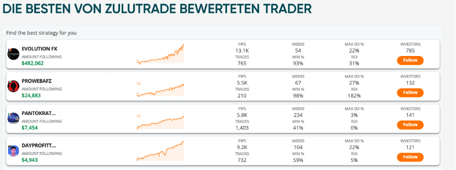 Leider werden die mit diesem Projekt verbundenen Kosten nicht offengelegt. Anleger bei ZuluTrade haben die Möglichkeit, über 10.000 erfahrenen Händlern auf den Devisenmärkten zu folgen. Dieser Ansatz hilft Ihnen, von ihnen zu lernen, Taktiken oder Erfahrungen zu übernehmen und kritisch zu bewerten und sich letztlich selbst zu verbessern. Nach Angaben von Vantage Markets haben diese Trader im letzten Jahr gemeinsam mehr als 800 Milliarden Dollar gehandelt.