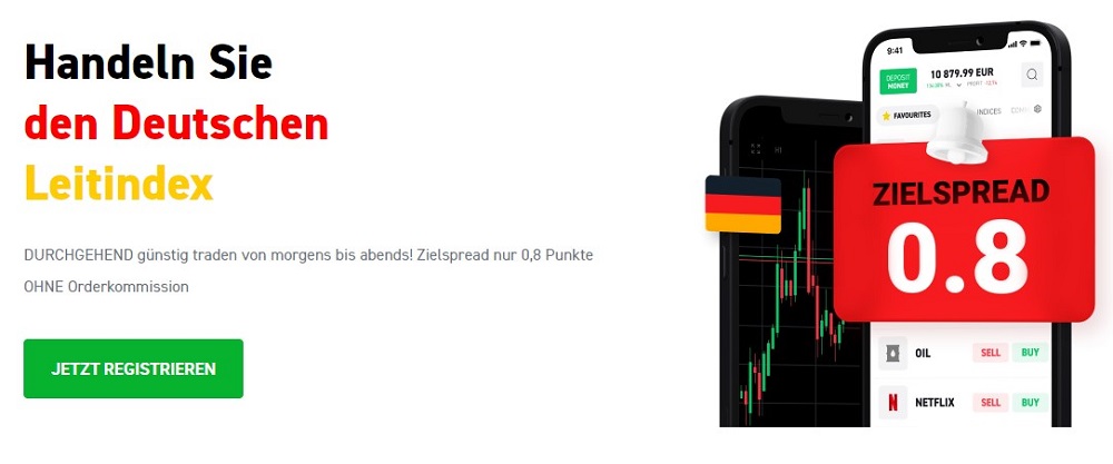 Trader können momentan den Deutschen Leitindex mit einem gesenkten Zielspread von nur 0.8 Punkten durchgehend, von 8 Uhr morgens bis 22 Uhr abends, traden. Außerdem fallen hierbei keinerlei Kommissionen oder Ordergebühren an.