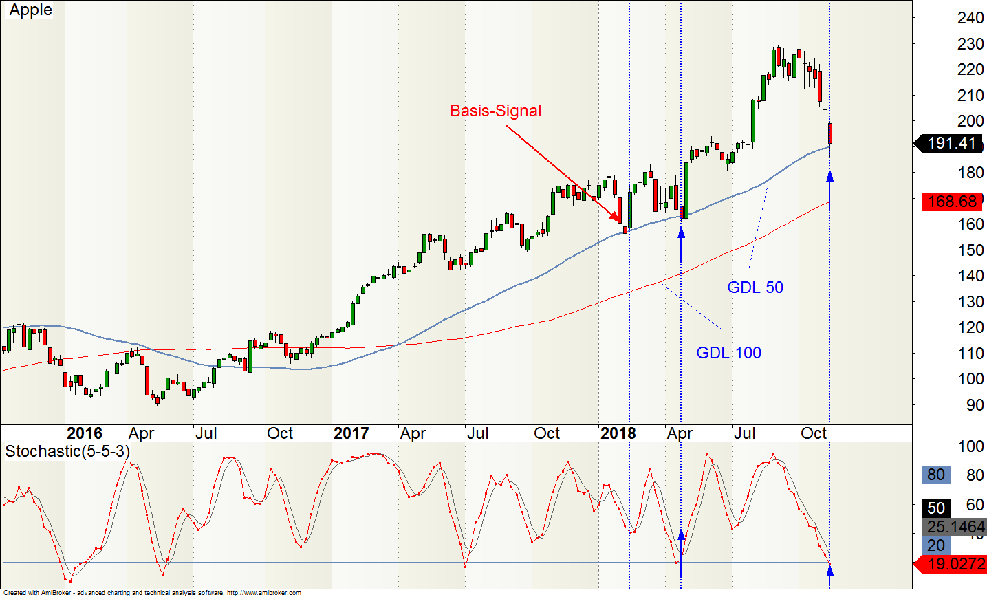 Das Fazit der Analysten lässt sich am Kursverlauf der Apple-Aktie nachvollziehen. Der Kurs stürzte kurzfristig ab. Wir sind jetzt an einem Punkt angekommen, wo das Handelssignal ideal zum Setup passt. Eine bullishe Gegenbewegung wird immer wahrscheinlicher. Wie weit diese nach oben führen kann, hängt natürlich auch ein wenig vom Gesamtmarkt ab. Sollte es zu einer Jahresendrallye kommen, entsteht aus der aktuellen Situation ein Signal mit erhöhter Wahrscheinlichkeit. Also genau etwas, was professionelle Trader immer suchen. Sie wollen bei allen Trades immer die Wahrscheinlichkeiten auf ihrer Seite haben.
