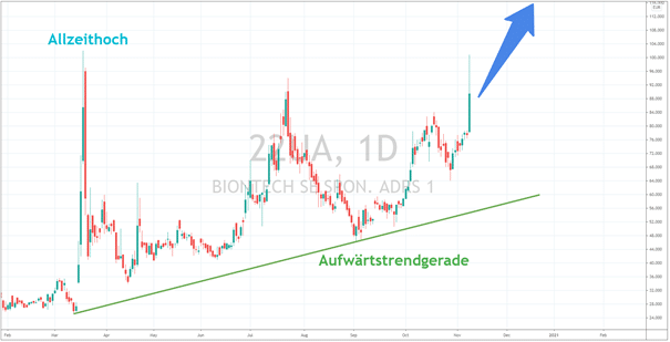 Auch aus charttechnischer Sicht sind die Papiere des Unternehmens aktuell sehr interessant. So sieht man an der grünen Trendgerade, dass sich die Aktie von BioNTech in einem Aufwärtstrend befindet. Das Allzeithoch aus dem März liegt bei 102 Euro. Gestern wurde dieses Hoch während des Tages fast wieder erreicht.