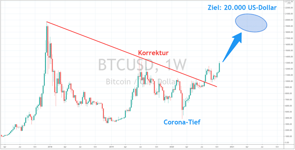 So sieht es aktuell so aus, als ob die größere Korrektur nunmehr ihr Ende gefunden hat. Als Ziel winkt dabei zunächst das Allzeithoch bei knapp 20.000 US-Dollar. Da die Kryptowährung aktuell bei rund 13.000 US-Dollar notiert, bedeutet dies eine Kurs-Chance von über 50 %.