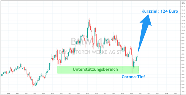 Wie bereits erwähnt, ist die BMW Aktie auch aus charttechnischer Sicht interessant. So sind die Papiere in den Jahren 2011 bis 2015 stark angestiegen. Das Allzeithoch wurde hierbei im März 2015 bei knapp 124 Euro erreicht. Nach diesen starken Kursanstiegen war es ganz normal, dass es im Folgenden zu einer größeren Korrekturphase gekommen ist. Während des weltweiten Lockdowns im März 2020 wurde dann nochmals der Unterstützungsbereich bei 45 Euro getestet. Damit ergibt sich nunmehr das Muster eines doppelten Bodens. Dies spricht dafür, dass der Aufwärtstrend nunmehr fortgesetzt werden wird.