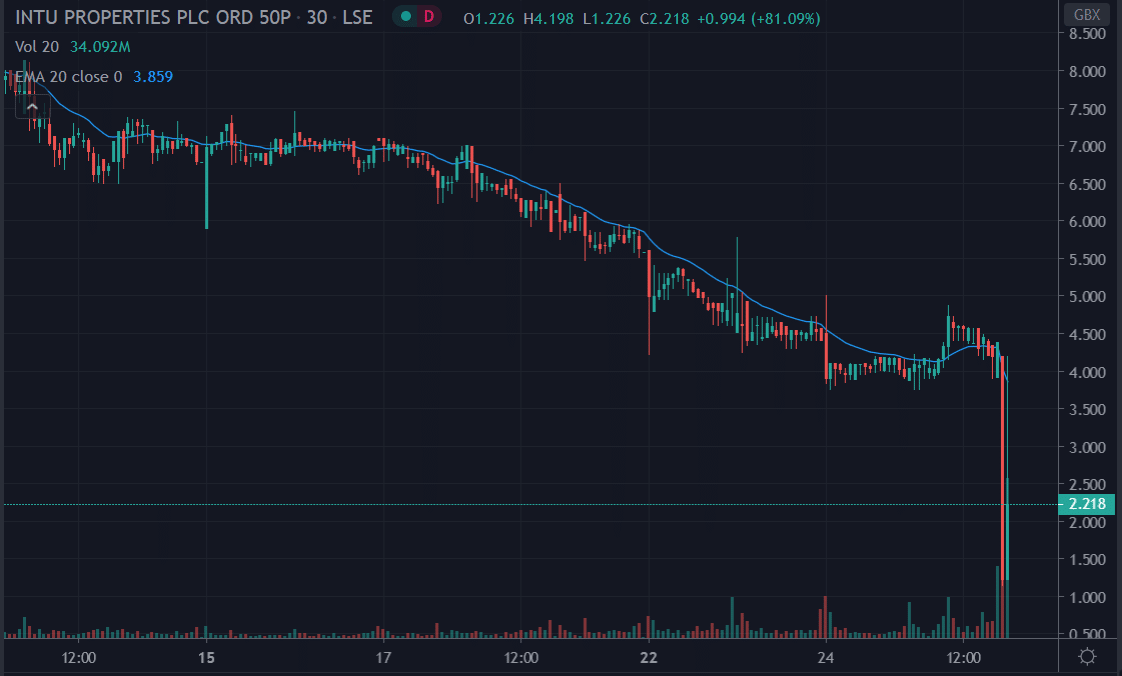 Heute bei Börsenbeginn fielen die Aktien von Intu Properties Plc (LON: INTU) um 86%, nachdem das Unternehmen bekannt gab, es könne keine Vereinbarung mit den Gläubigern aushandeln. Der Eigentümer des britischen Immobilien-, Investment- und Versicherungsunternehmens gab an, dass die Einleitung eines Insolvenzverfahrens wahrscheinlich sei, da man kein Stillhalteabkommen mit den Gläubigern vereinbaren konnte.