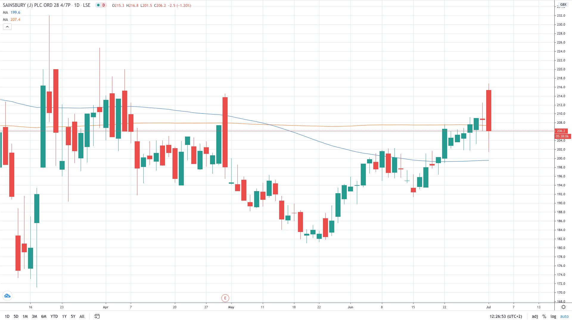 Die Sainsbury‘s Aktie ist im Moment im Vergleich zu gestern 2% weniger wert, obwohl sie bei Börsenbeginn am Morgen 3,1% höher lag. Das heutige Hoch von 216.8p markiert das 3-Monatshoch der Sainsbury‘s Aktie.