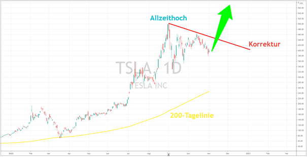 Die Aktien von Tesla befinden sich aktuell noch in der Korrekturphase. Dies erkennt man auch gut an der roten Abwärtstrendgerade. Allerdings dürfte sich der Aufwärtstrend nach einem Sieg von Biden fortsetzen. Dazu ist es erforderlich, dass die rote Trendgerade nach oben durchbrochen wird. Bullish ist auf jeden Fall die Tatsache, dass die Papiere von Tesla sich über der 200-Tagelinie befinden.