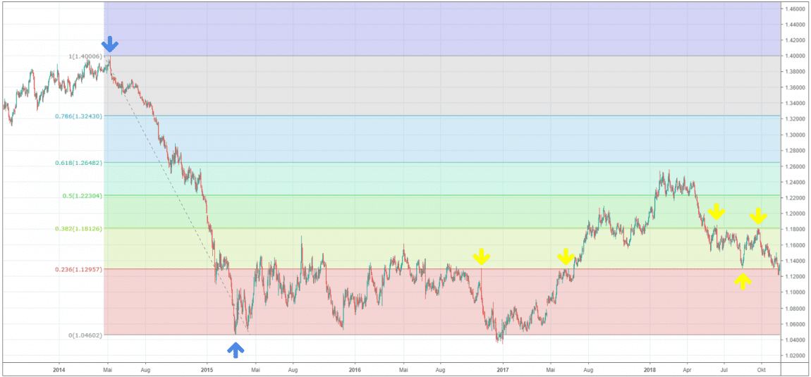 So erkennt man den großen übergeordneten Abwärtstrend, in dem sich das Währungspaar seit Mai 2014 befindet. Ausgelöst wurde dieser starke Kursrutsch dabei durch den Präsidenten der Europäischen Zentralbank (Mario Draghi), welcher angekündigt hat, die europäischen Staaten mit allen Mitteln zu stützen. Dies wurde von den Marktteilnehmern so verstanden, dass es infolgedessen zu einer Schwächung der Gemeinschaftswährung kommen würde. Den Anfang und den Beginn der Bewegung haben wir dabei mit zwei blauen Pfeilen markiert. Im Rahmen dieser Bewegung ist der EUR / USD von rund 1,4000 Pips auf rund 1,0460 Pips gefallen. Auf diese Bewegung haben wir die Fibonacci Levels angelegt. Man erkennt, dass das Währungspaar die vorangegangene Bewegung mittlerweile zu fast 2 / 3 korrigiert hat. Nunmehr haben allerdings wieder die Bären das Ruder übernommen, weshalb die Kurse seit einiger Zeit wieder im Fallen begriffen sind. Bemerkenswert ist dabei, dass die Fibonacci Linien von 2014 (!) heutzutage immer noch relevant sind. Dies haben wir an mehreren Stellen im Chart beispielhaft mit gelben Pfeilen markiert. Sehr schön ist dabei erkennbar, dass die Fibonacci Levels dabei sowohl als Widerstand, als auch als Unterstützung für den Kurs fungieren können.