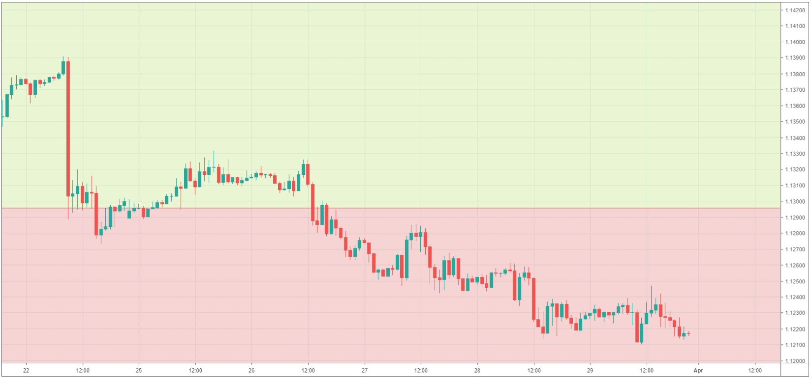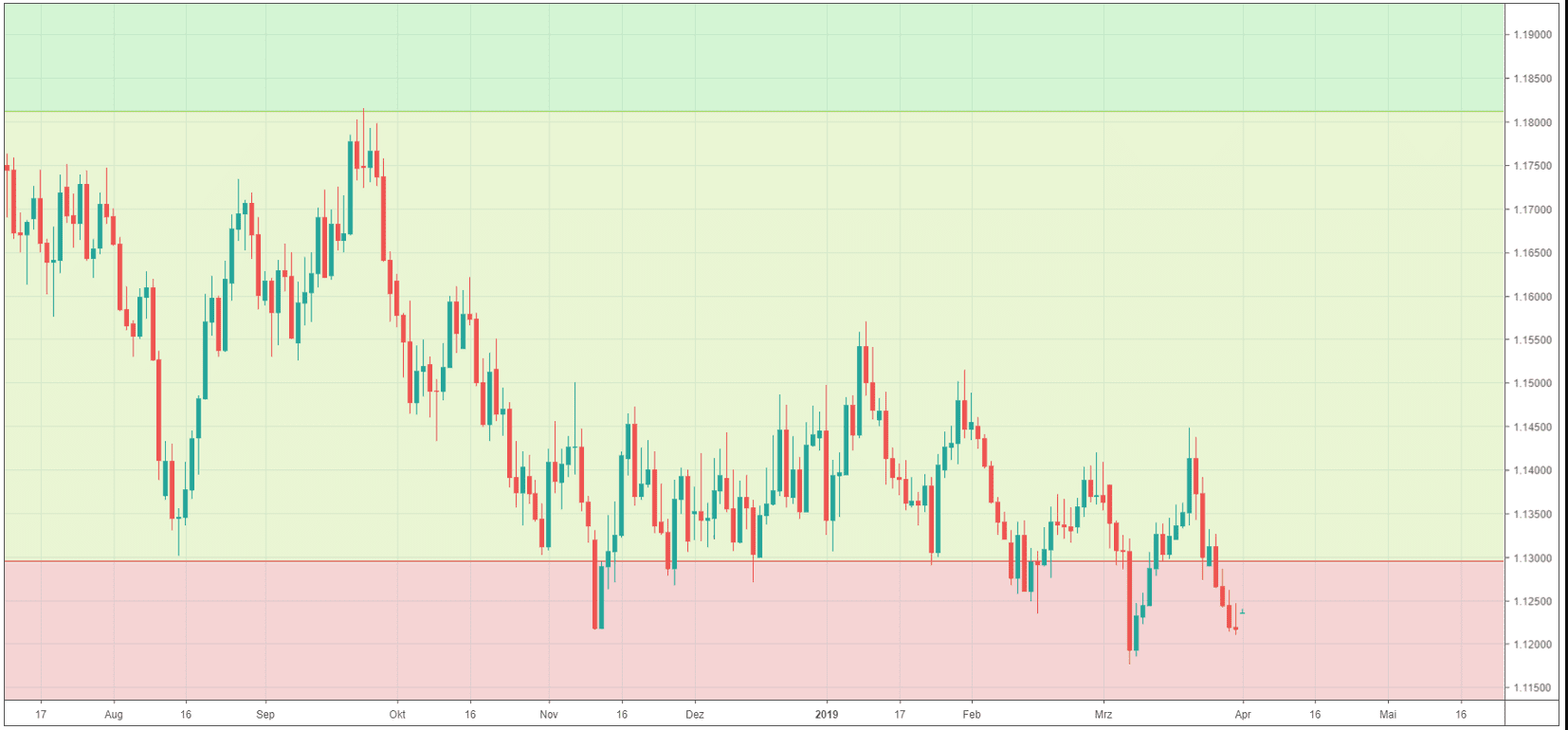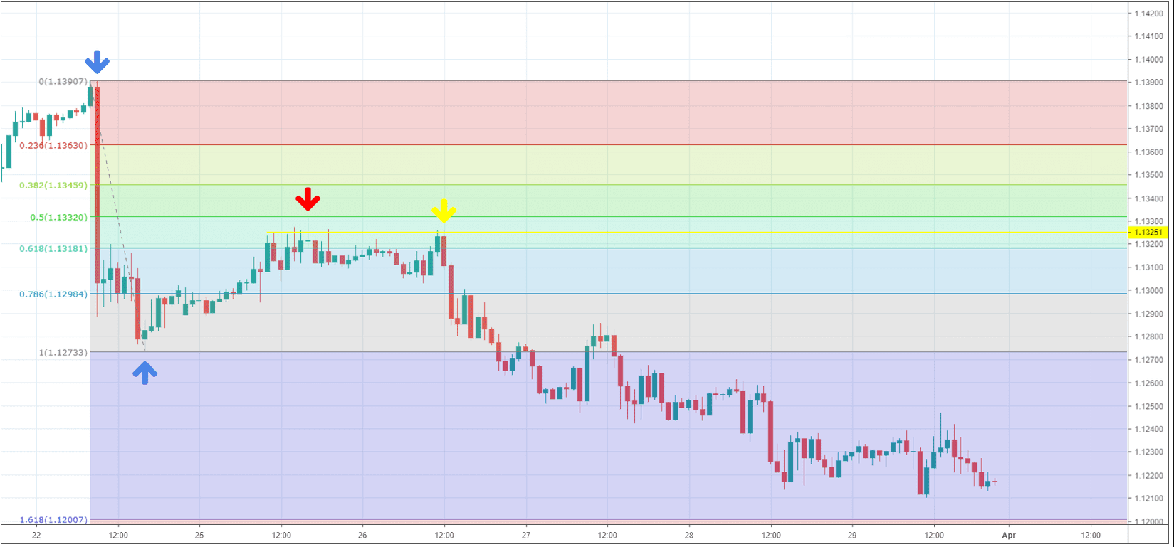 Man erkennt auf den ersten Blick, dass es beim EUR / USD am Freitag, 22. März 2019 zu einer starken Abwärtsbewegung kam. Diese Bewegung haben wir im nächsten Bild wiederum mit zwei blauen Pfeilen markiert. Zur besseren Übersichtlichkeit haben wir dabei die Fibonacci Linien aus der großen Zeiteinheit entfernt. Dafür legen wir nunmehr die Fibonacci Levels auf die Abwärtsbewegung (blaue Pfeile) an: