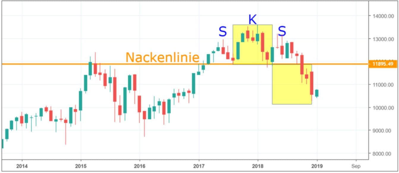 Durch die beiden gelben Rechtecke erkennt man, bis wohin die Kurse voraussichtlich nach dem Bruch der Nackenlinie laufen werden. Würde einem zum Beispiel ein Einstieg an der Nackenlinie bei 11.895 Punkten gelingen, so wäre das Kursziel bei rund 10.100 Punkten. Die Chance bei diesem Trade würde daher rund 1.800 Punkte betragen. Beim Handel auf dem Monats Chart sind aber aufgrund der großen Kerzen auch die Stopp Kurse sehr groß. Würde man sich zum Beispiel dazu entscheiden, den Stopp auf das Hoch der rechten Schulter bei rund 13.200 Punkten zu setzen, so würde das Risiko bei diesem Trade rund 1.300 Punkte betragen. Das CRV würde in diesem Fall daher rund 1,3 betragen.