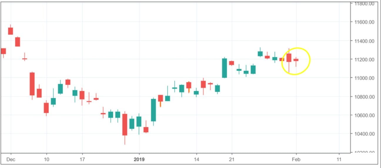 Auch auf dem Stunden Chart erkennt man weiterhin den gelben Kreis, der die beiden Handelstage (Donnerstag, 31.01.2019 und Freitag, 01.02.2019) umfasst, welche wir uns im Folgenden für den Trade of the Week genauer ansehen möchten. Bereits beim ersten Betrachten des Charts fällt ins Auge, dass der DAX am Donnerstag mit einem Gap eröffnet. In einem solchen Fall muss man als Trader, wie gesagt, immer damit rechnen, dass eine solche Kurslücke früher oder später auch wieder geschlossen wird. Jedenfalls gelingt es den Bullen, den DAX zunächst über 11.300 Punkte zu kaufen. Damit wird fast das vorherige Hoch bei 11.320 Punkten erreicht. Durch diese beiden Hochs (rote Pfeile) ergibt sich die Chartformation eines Doppel Tops. Dies deutet auf eine Schwäche der Käufer hin und man muss somit damit rechnen, dass die Kurse alsbald fallen werden: