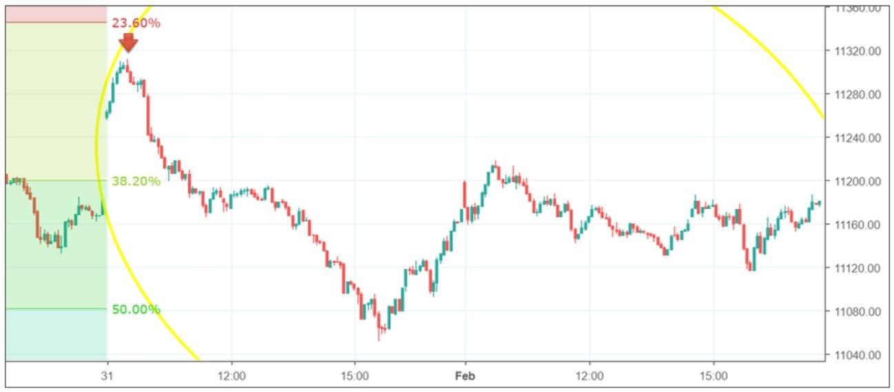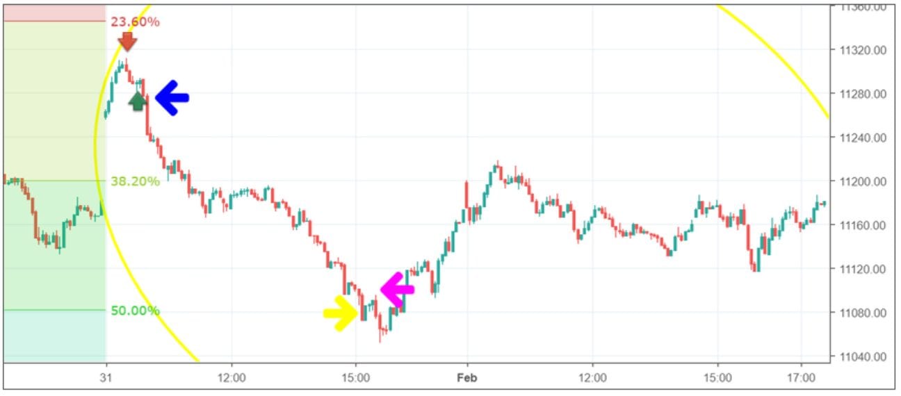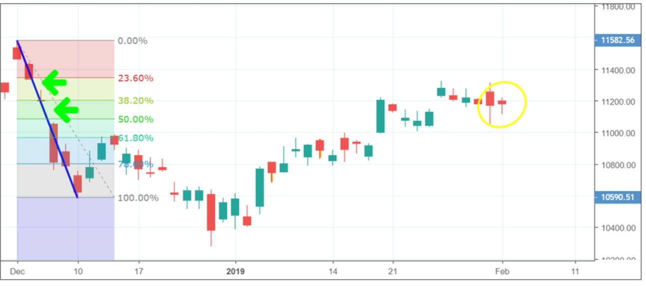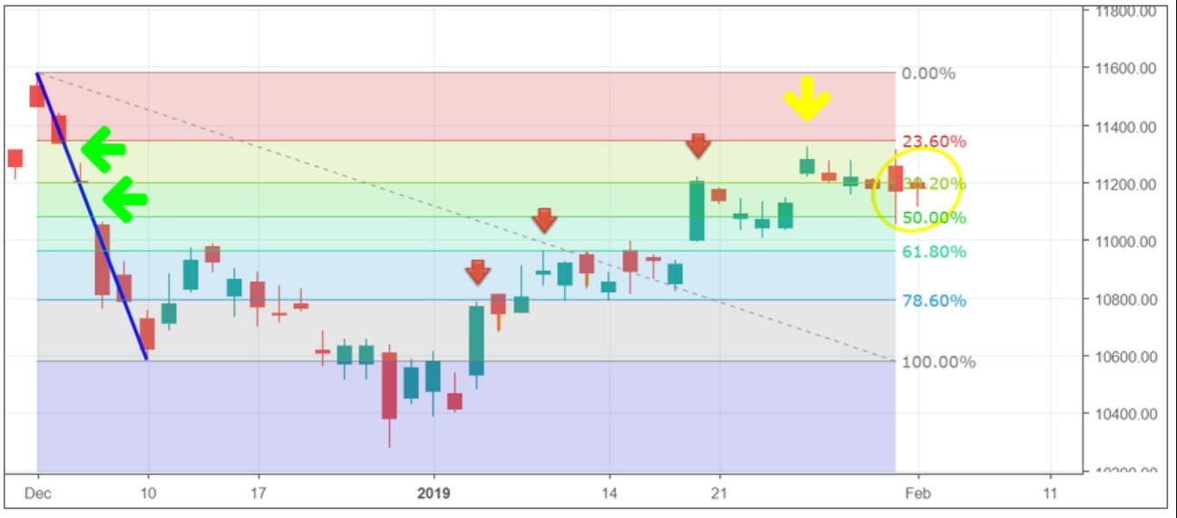 Noch größer wäre der Gewinn ausgefallen, wenn man den Trade von Hand zum Beispiel bei 11.080 Punkten geschlossen hätte. Dafür hätte gesprochen, dass sich der Fibonacci Level von 50 % (gelber Pfeil) in diesem Bereich befindet.