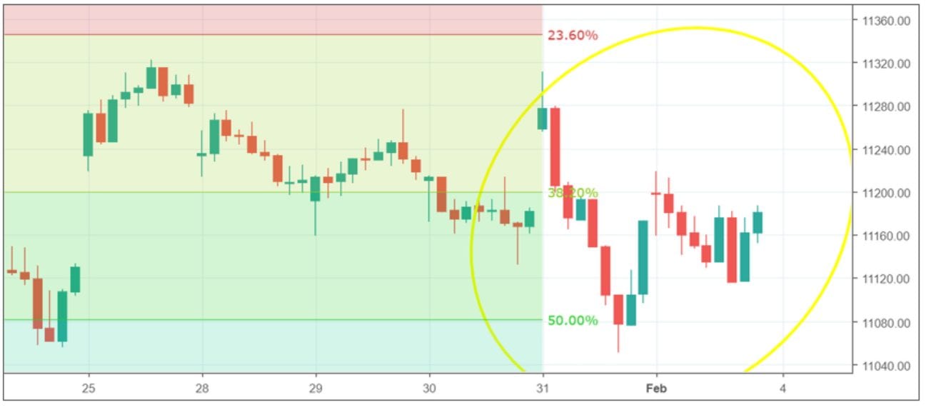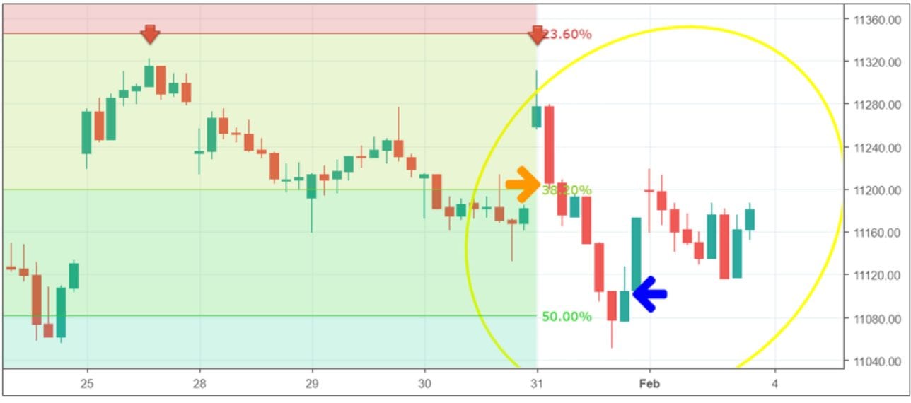 Dies wäre daher das erste Signal für einen Short Trade gewesen. Ein weiteres Signal entsteht durch die Kerzen: So ist die erste Stunden Kerze des Tages zunächst grün. Jedoch wird diese durch die darauffolgende große rote Kerze neutralisiert, wodurch sich ein sehr starkes Short Signal ergibt. Man konnte sich daher unterhalb der roten Kerze (oranger Pfeil) bei 11.200 Punkten Short einstoppen lassen. Den Stopp Loss hätte man dabei auf das Hoch der vorherigen Kerze legen können. Durch das Nachziehen des Stopps wäre man schließlich bei rund 11.100 Punkten ausgestoppt worden. Im Endeffekt hätte man daher mit diesem Trade rund 100 Punkte verdient.
