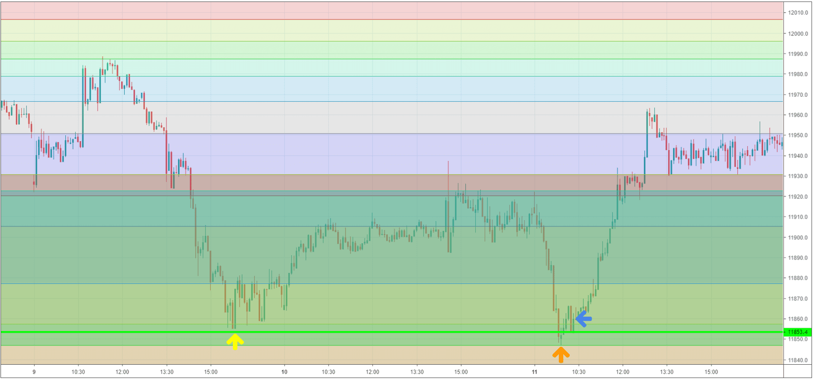 Beim gelben Pfeil erkennt man, dass die grüne Unterstützungslinie von oben her getestet wurde. Da die Unterstützung gehalten hat, kam es im Folgenden zu steigen Kursen. Beim orangen Pfeil wurde die Linie dann erneut in Angriff genommen. Diesmal ist es den Bären auch kurzzeitig gelungen, die 5 Minuten Kerzen unter der Unterstützung zu schließen. Allerdings fand der Dax seinen nächsten Halt bereits am nächsten Fibonacci Level: beim 2,414 fachen der ursprünglichen Bewegung (oranger Pfeil). Wie gesagt, können die Fibonacci Levels auch nach vielen Tagen eine wichtige Rolle als Widerstand oder Unterstützung spielen. Nachdem die Kurse wieder über die grüne Linie gestiegen waren, konnte man bereits an einen Long Trade denken. Denn offensichtlich sind die Käufer an dieser Stelle in der Überzahl, was steigende Kurse bedeuten sollte. Häufig testet der Kurs nach einem Durchbruch diese Linie erneut, was man auch beim Dax beobachten konnte. Nachdem es daher den Bären erneut nicht gelang, die Kurse weiter fallen zu lassen, konnte man sich nach der grünen Kerze (blauer Pfeil) bei rund 11.860 Punkten einstoppen lassen. Denn diese Kerze neutralisierte die vorangegangene rote Kerze, indem sie zu ca. 50 % in deren Körper eindrang und auch auf diesem Niveau schloss. Den Stopp Loss hätte man unter das Tief (oranger Pfeil) legen können.