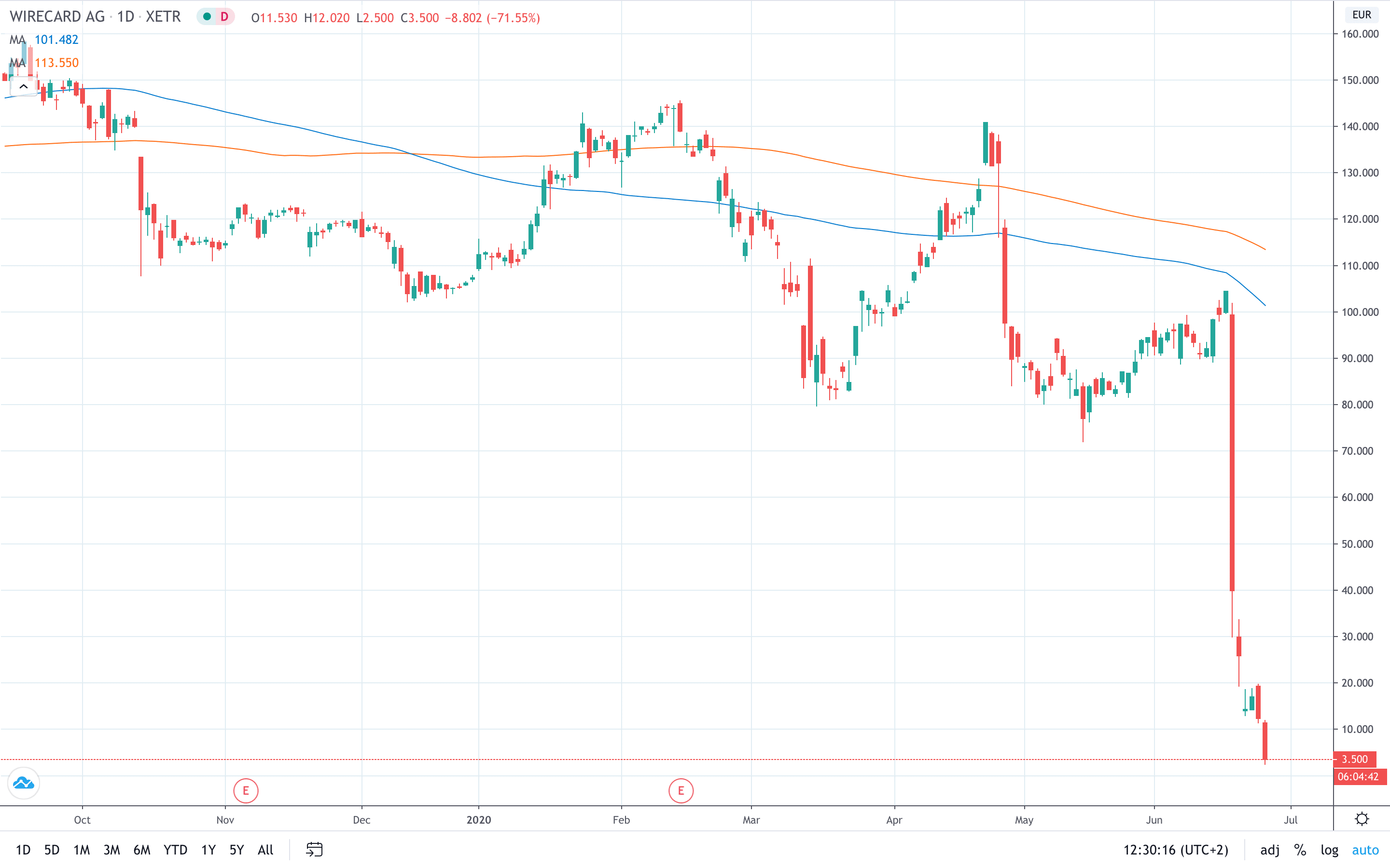 Die Aktienkurse des Unternehmens fielen in bloß einer Woche um 98% und werden zu einem Rekordtief gehandelt. Im Moment kostet die Wirecard Aktie 3,44 €, ein Verlust von 72% an einem Tag.