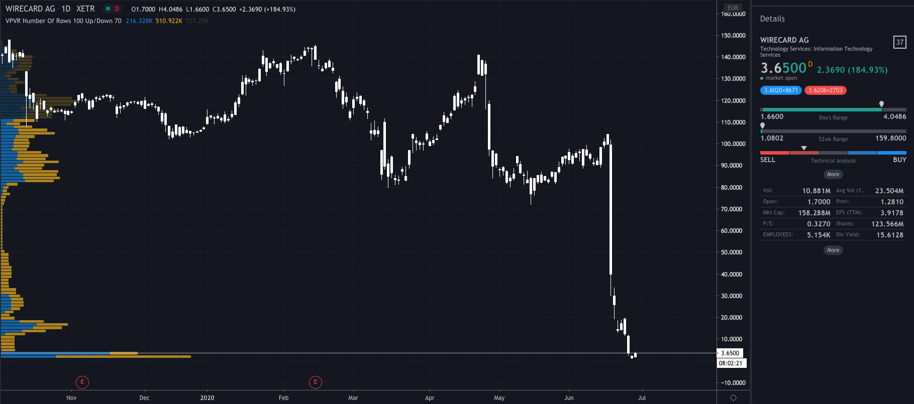 Die Aktie von Wirecard ist heute Morgen um 158,56% angestiegen, obwohl das Unternehmen vergangenen Donnerstag ein Insolvenzverfahren beantragt hat.