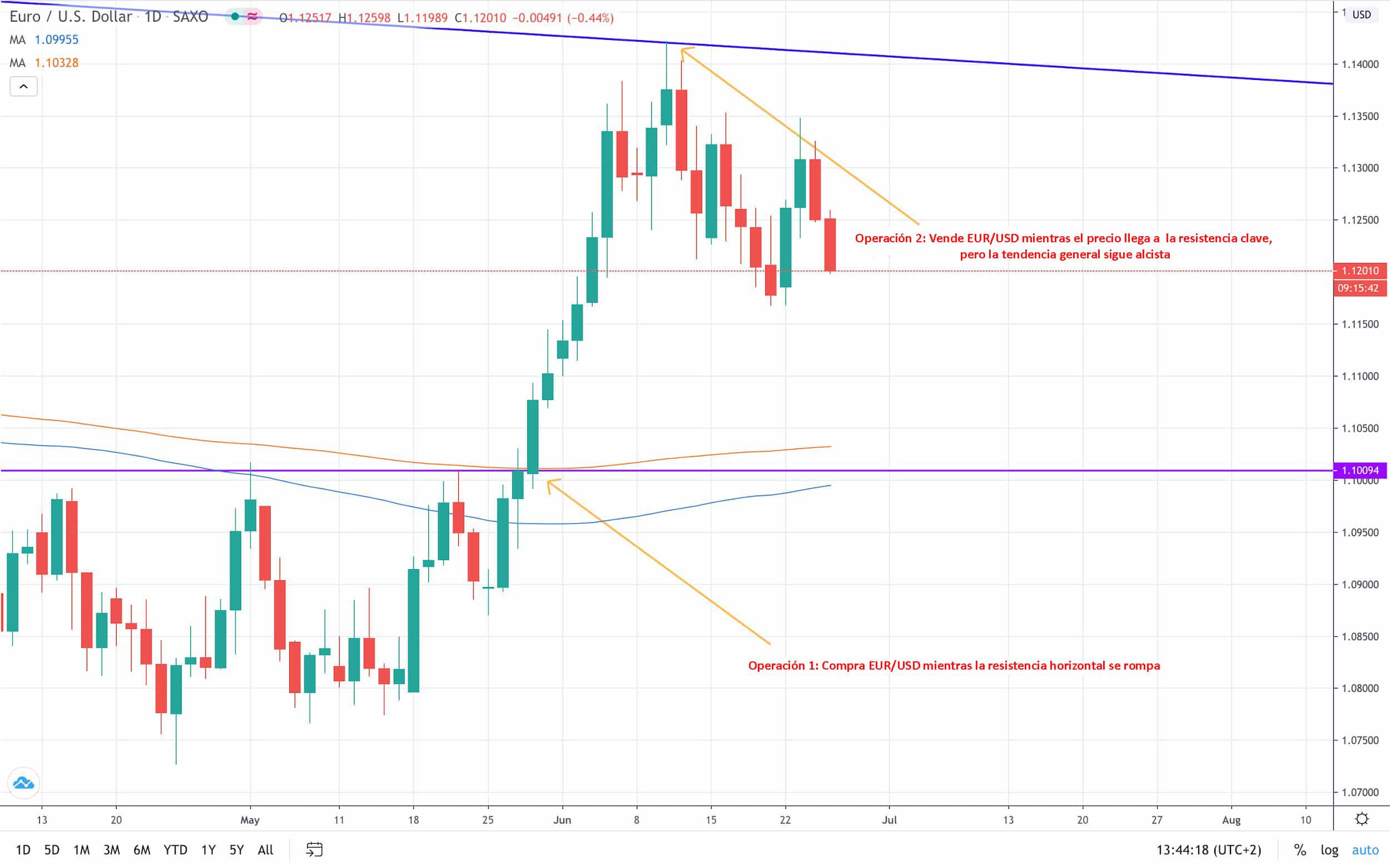 Como aún crees que la tendencia general es alcista y EUR/USD aún tiene margen para ganancias, decides no reservar las ganancias. En vez, decides abrir una segunda operación para cubrirlo. De esta forma, estás protegido/a contra las pérdidas a corto plazo en tu primera operación. La segunda es una operación a corto plazo de una naturaleza swing.
