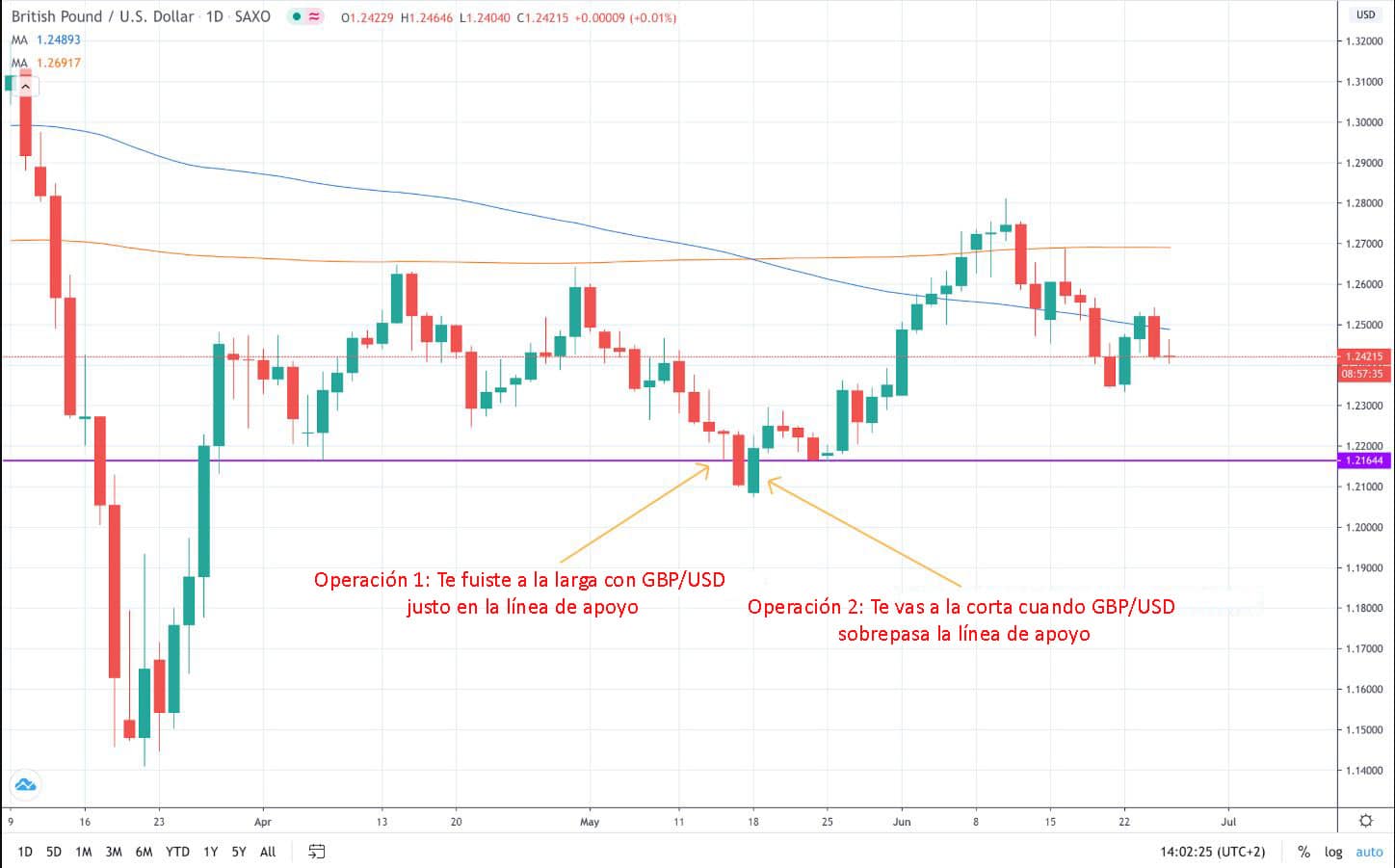 Digamos que decides tomar una posición larga en GBP/USD cerca del apoyo horizontal a $1.2165. Luego, la acción del precio rompe por debajo, amenazándote con aumentar tus pérdidas. Para mitigar el riesgo de esto decides tomar una posición corta en GBP/USD.