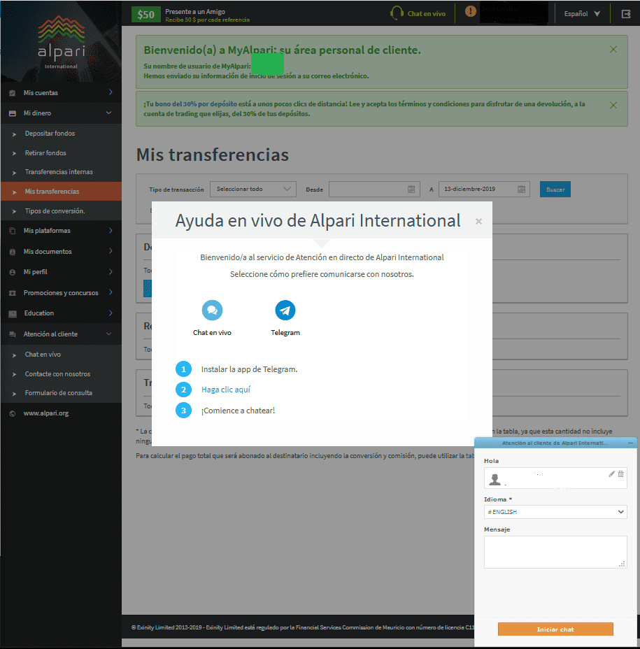 - Si hace clic en “Chat en vivo”, le aparecerá una ventana de diálogo que le preguntara cómo prefiere comunicarse con Alpari: por medio de Chat en vivo o por medio del app de Telegram.