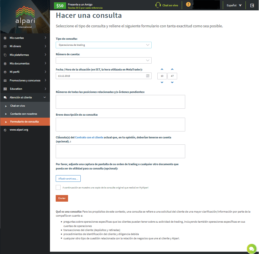 - Breve descripción de su consulta – este campo es para que usted le explique a Alpari la razón por su consulta.