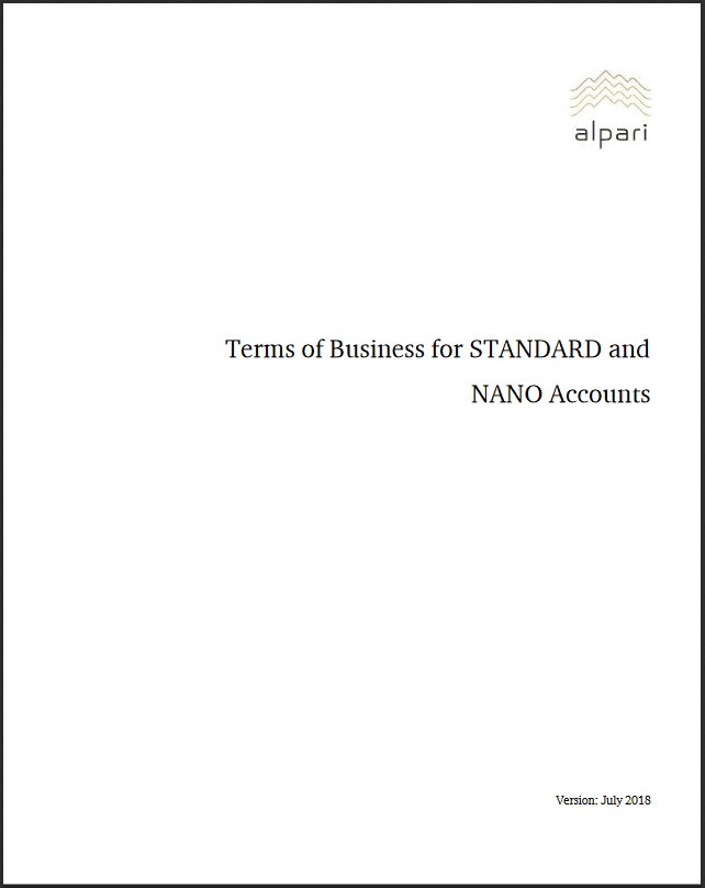 Haga clic en este enlace para acceder un documento PDF de los términos y condiciones Alpari para cuentas estándar y NANO. Para acceder un PDF de los términos y condiciones Alpari para cuentas ECN y PRO.ECN, haga clic aquí.