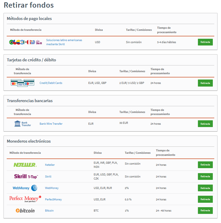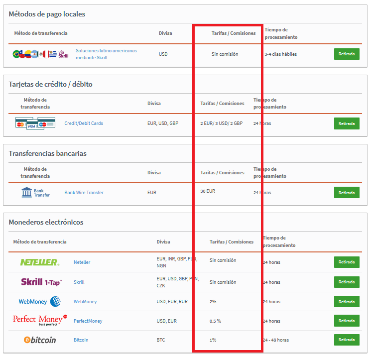 Para operadores activos, pagar menos en cuotas y comisiones se refleja en su balance. En algunos métodos de transferencia, no se cobran cuotas retiro Alpari. Sin embargo, Alpari le cobra 30 EUR para procesar una transferencia bancaria, además de lo que le puede cobrar su banco. Las comisiones retiro Alpari se pueden ver abajo y en la página de retiros.