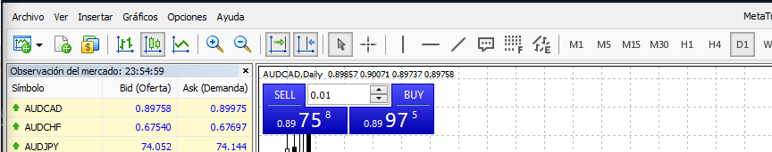 Abajo de la banda de símbolos se encuentra una caja azul con los precios de oferta y demanda y un rectángulo para ingresar la cantidad de su orden. Después de ingresar la cantidad, puede oprimir el lado derecho para comprar y el lado izquierdo para vender. Si quiere entrar un nivel determinado, tendrá que abrir el menú de Nueva Orden.