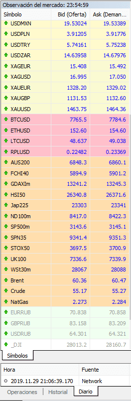 Como puede notar en el gráfico abajo, la ventana de Observación del Mercado muestra los diferentes activos que puede acceder con su cuenta demo FXTM. Además de divisas como el peso mexicano y la lira turquesa, puede operar en diversos mercados como el oro y la plata contra el dólar estadounidense, la libra esterlina y el euro, CFDs sobre criptomonedas, índices, y petróleo y gas natural.