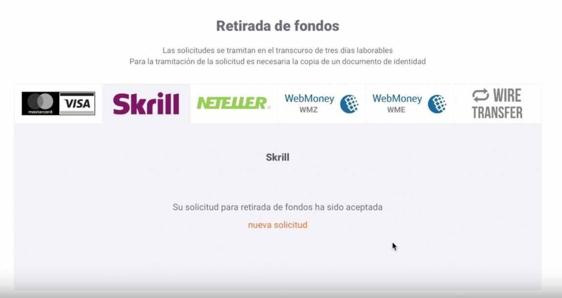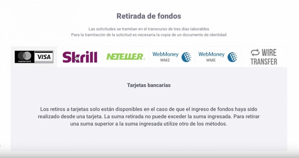 Ahora bien, si la retirada está dirigida a tarjetas Visa o MasterCard, el retiro es instantáneo, aunque tal y como lo dicen en la web de IQ, “puede que el banco emisor tarde hasta 9 días hábiles en procesar el pago.”
