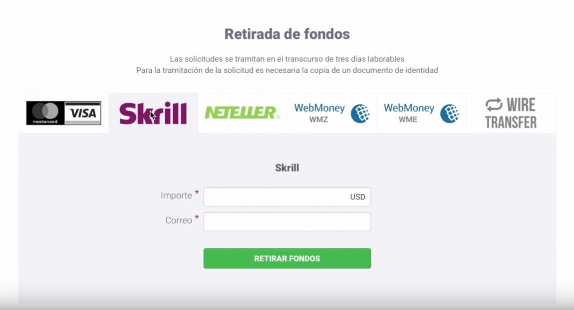 Paso 4: Una vez redireccionado a la página de retiros de IQ Option. Selecciona el método de retirada de fondos. Para este caso usaremos el ejemplo de Skrill, que aparte de ser rápido, es menos costoso.
