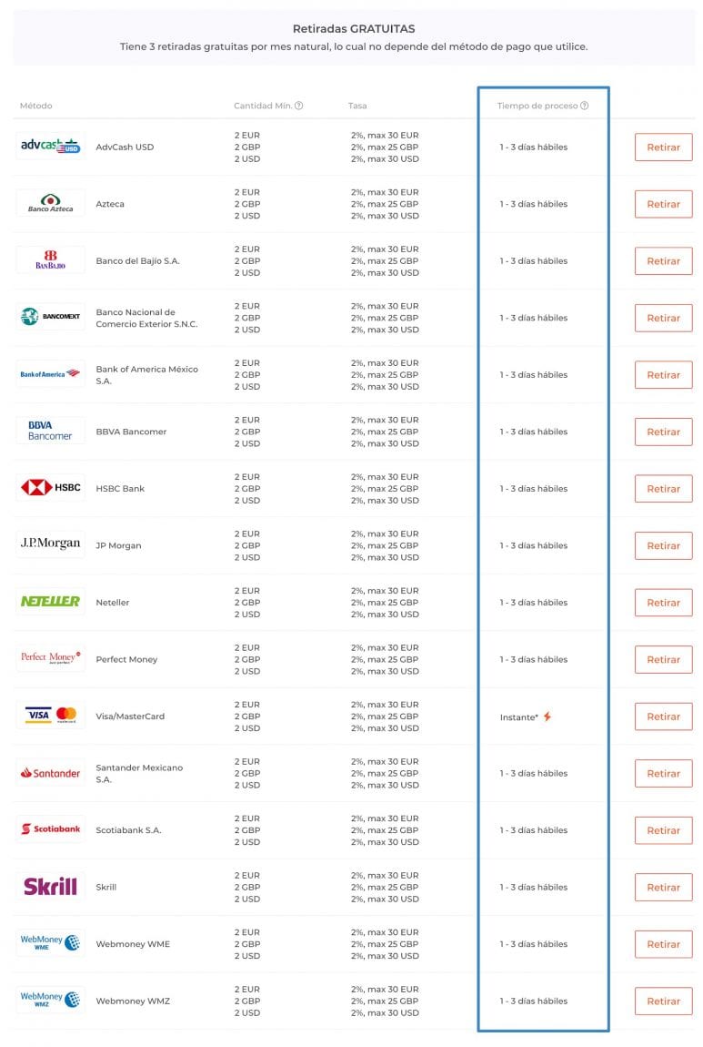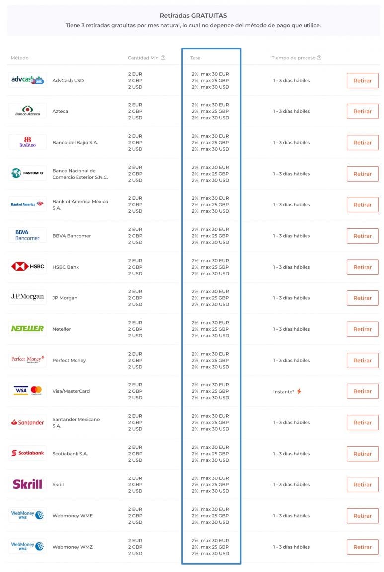Lo primero que debes tener en cuenta es que el broker ofrece tres retiradas gratuitas para usuarios en México, pero a partir de la cuart cobra una cuota o comisión de retiro, y no es barata. Asimismo, la retirada mínima es de 2 dólares,o su equivalente en pesos mexicanos.
