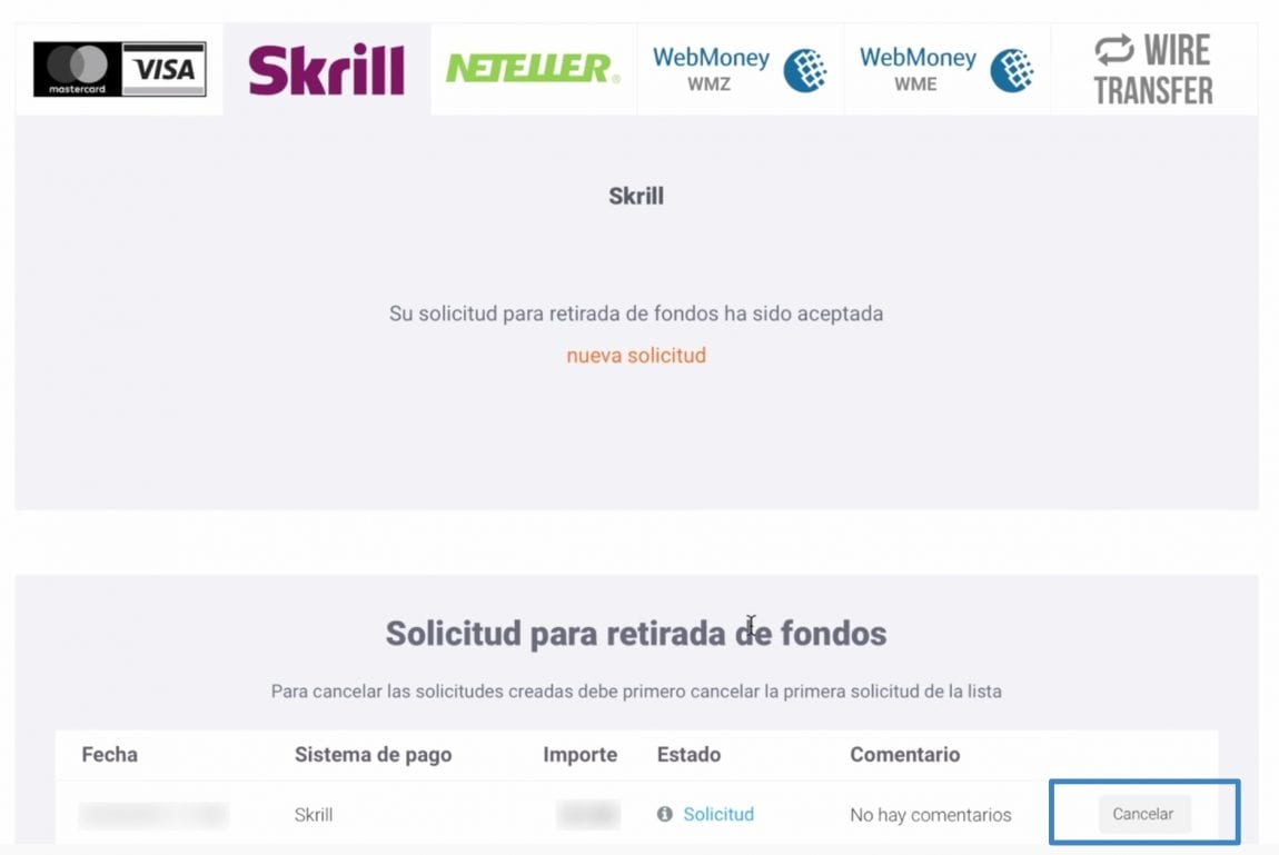 Para cancelar tu retirada de fondos en IQ Option, en la misma página donde efectuaste la solicitud, baja hasta la sección de «Solicitud para retirada de fondos» e identifica la transacción que quieres cancelar.