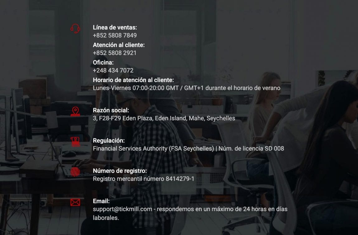 Tickmill ofrece tres líneas telefónicas a disposición de sus clientes. Una de línea de ventas, otra de atención al cliente propiamente dicho y la tercera la línea directa a sus oficinas en Seychelles.